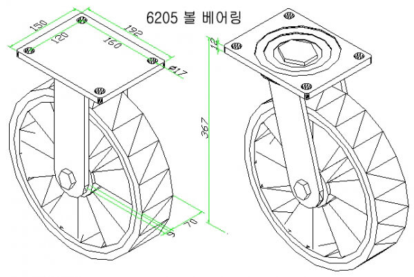 볼베어링 사용 주물 우레탄 바퀴에 볼베어링을 장착하여 부드러운 이동